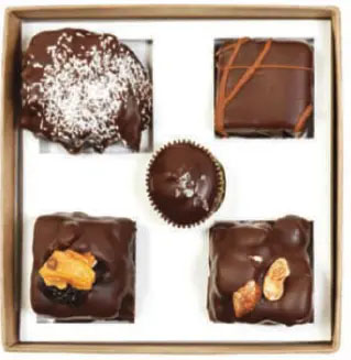 My enrobed chocolates consist of cashew chews, coconut squares, dried cherry and almond chocolates, milk chocolate velvet squares, and my award winning creamy caramel cups with sea salt. My personal favorite, the cashew chew, has a wonderful cashew crunch combined with vanilla caramel, sea salt, and dipped in dark chocolate.